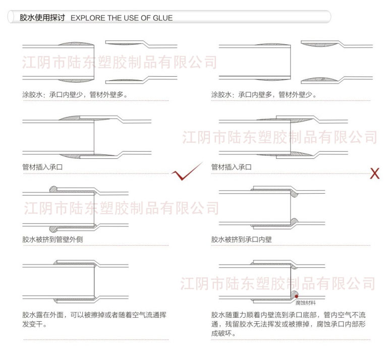 当然,在本网站中,江阴市陆东塑胶制品有限公司已经在之前的技术文献里发表过图示,正确涂抹胶水,安装水管的对比图,在这里,再次发布给做工程的同僚们看一下,加深印象,这样在做PVC-U化工管件、UPVC工业管件这些对接操作的时候就不会有任何问题了。